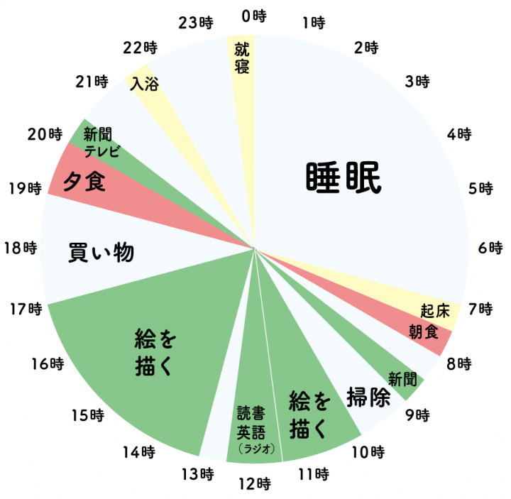 自由時間(緑色部分)のほとんどは、絵を描く時間に。運動不足にならないよう、毎日散歩がてら買い物に行きます。(72歳・男性)
