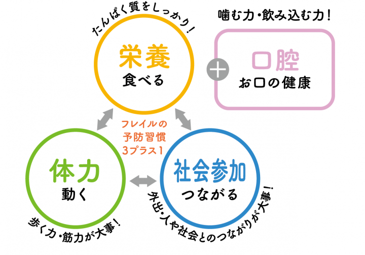 フレイル予防には、“3プラス1”の習慣が有効であり、外出や人との交流などの社会参加も重要な要素の一つです。
