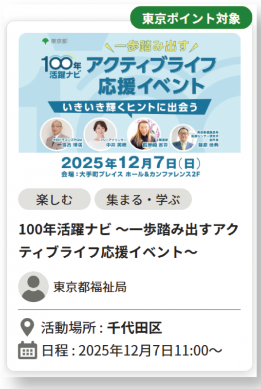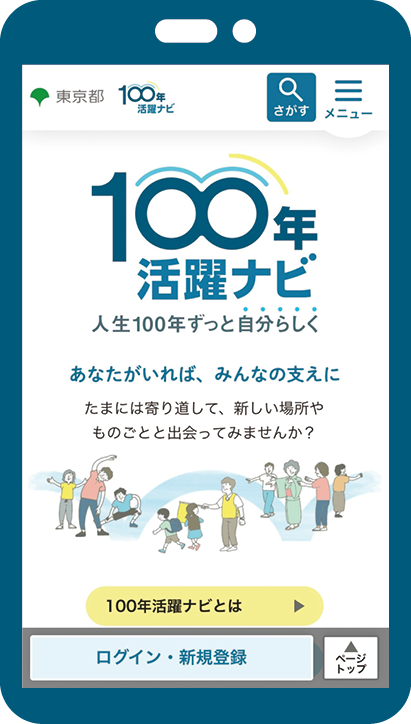 「100年活躍ナビ」は、シニア・プレシニアと、趣味や健康づくり、ボランティアなどの社会参加活動をつなぐWEBサイトです。興味のある活動やイベント等に参加するなど、新たな一歩を踏み出すために、ぜひ活用してください。