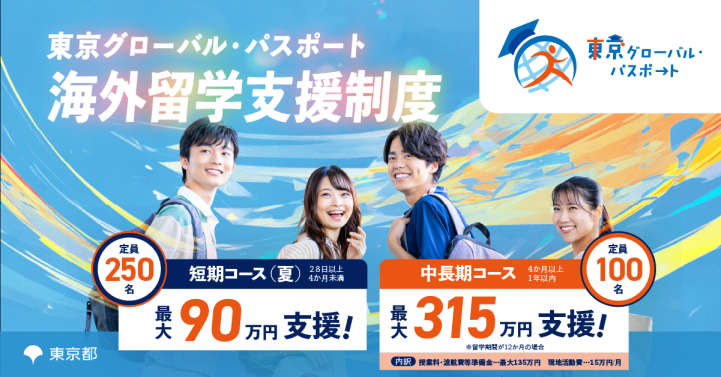 グローバル人材の育成に向け、8年夏以降に出発の海外留学費用を所得制限なしで支援します。