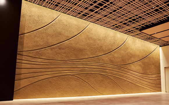 入口を進むと東京マイスター・久住有生氏による幅約11メートル、高さ約4メートルの左官仕上げを施した壁がお出迎え。左官技術が凝縮された美しい仕上がりは圧巻です。
