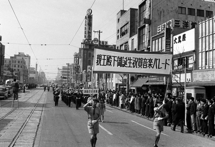 2月29日、徳仁親王殿下(現在の皇太子殿下)のご誕生をお祝いし、盛大な「祝賀音楽パレード」を開催した。写真は西新橋での様子。